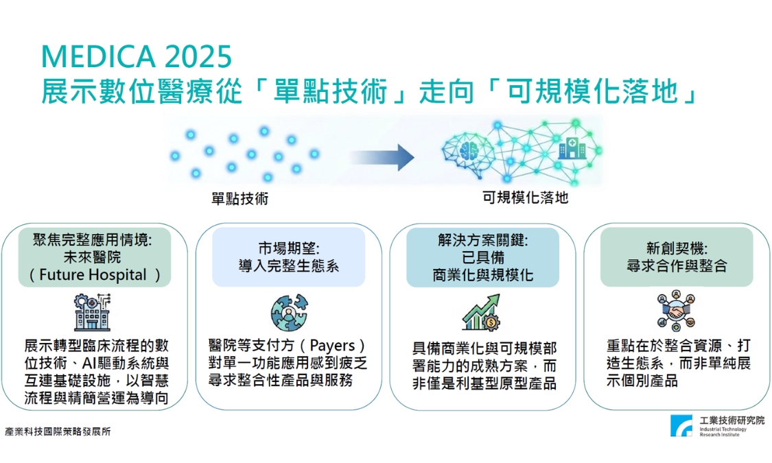 本期 Monthly 彙整「從 MEDICA 到 CES:數位醫療與健康科技的關鍵趨勢與智慧未來研討會」重點觀察,盤點六大關鍵趨勢,解析醫療級穿戴供應鏈成形、AI 臨床落地與平台整合深化等結構變化,並進一步思考臺灣在 ICT 與半導體優勢基礎上,如何在全球健康科技新局中建立長期競爭力。