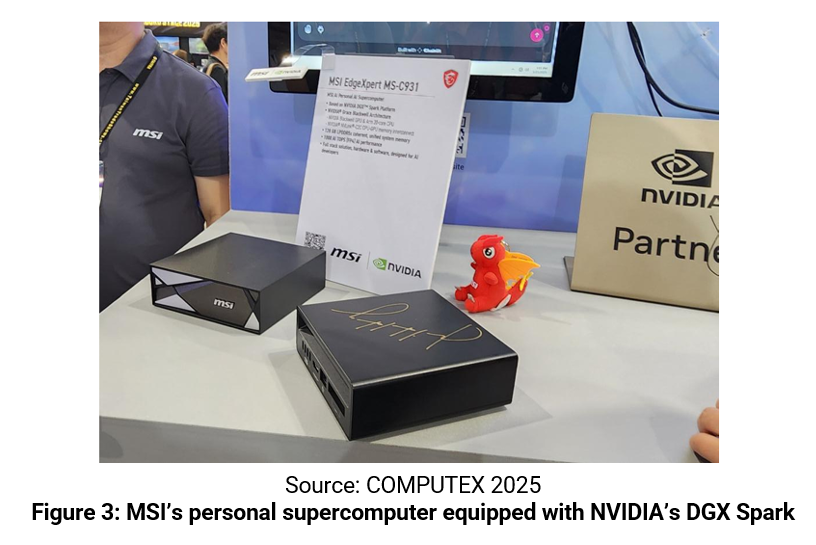 As far as personal devices are concerned, AI laptops and AI desktops were the key highlights. Qualcomm continues to focus on the WoA (Windows on Arm) AI PC market and announced it will launch its next-generation ARM PC processor in September. Intel and AMD demonstrated the capabilities of their AI PC chips to run AI applications on personal devices. MediaTek displayed its AI chips and solutions for the Google Chromebook system. The NVIDIA DGX Spark, which the company calls its highest-performance personal supercomputer, was presented by various PC brands each offering their own different hardware designs.