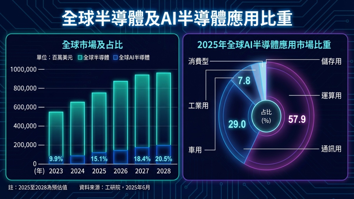 AI應用已成為推動半導體市場成長的重要引擎。市場研究機構Gartner預估,全球AI半導體市場占整體半導體市場比重從2023年的9.9%成長至2028年20.5%。2025年AI半導體市場估將占全球半導體市場的15.1%,應用領域以運算用(57.9%)與通訊用(29.0%)為主,其次為車用(7.8%)等。整體而言,AI帶動的高效能運算與通訊需求,已成為推升半導體產業成長的關鍵動能。