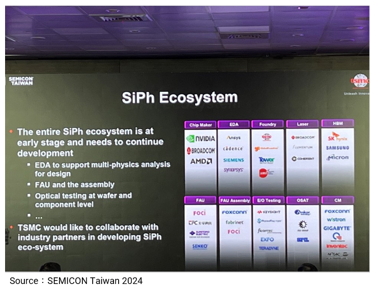 AI computing chips are not the only focus of market attention lately. The development of silicon photonics was also a highlight at SEMICON Taiwan 2024. Silicon photonics uses light waves for data transmission to significantly increase transmission speeds and reduce energy consumption, and hence it serves as a key technology for high-performance computing and data centers. Given the rapid growth of AI, 5G, and cloud computing, the market potential of silicon photonics is beginning to become apparent.