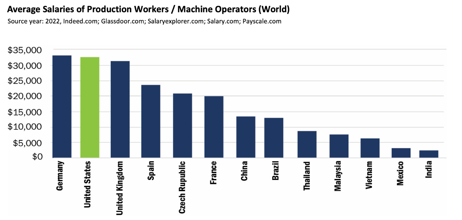 過往台灣製造業進軍海外設廠時,大多都會優先選擇中國、越南等勞動成本較低的生產大國,然而,根據 The Reshoring Institute 在 2022 年所發布的《全球勞動率比較報告》中指出,若以最基層的作業員、生產人員、機械操作員而言,中國及越南已不再屬於最低勞動成本的國家,反而是印度及墨西哥更具有低人力成本的優勢。