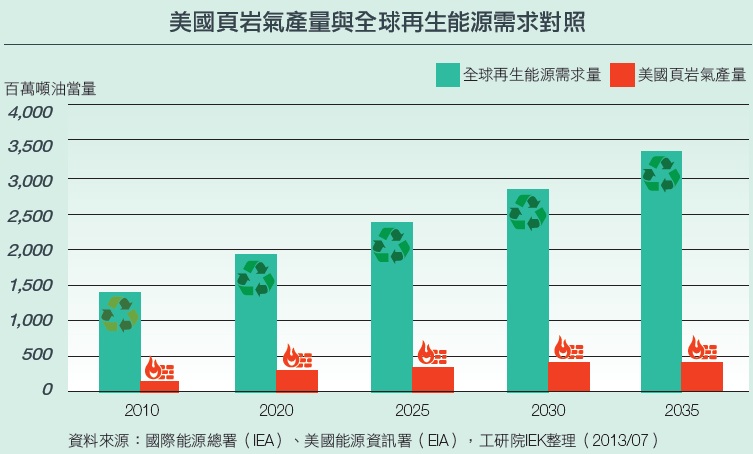 圖1 美國頁岩氣產量與全球再生能源需求對照