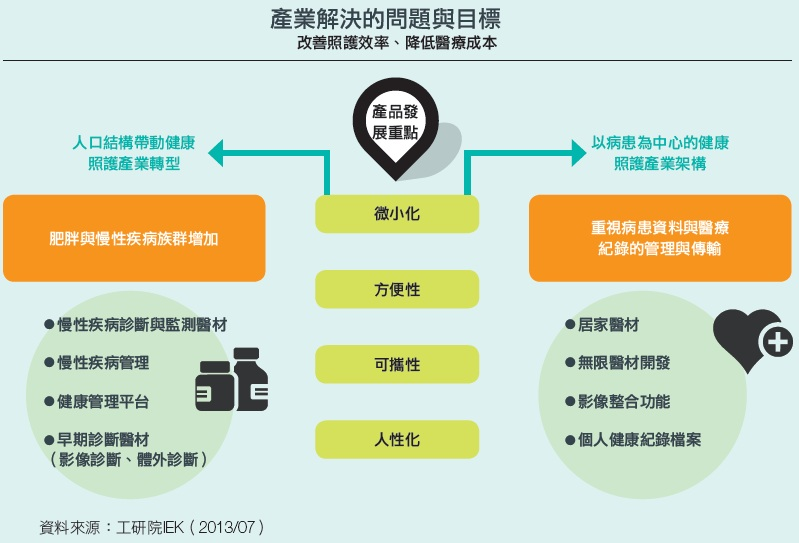 因此,相關產品或服務系統的創新,也是圍繞在提供整合型服務方案(Total Solution)的角度,如因應新興市場的巡診要求,醫材的方便性與可攜性,相對於以往更來得重要;而人口結構變化,使疾病流行病學發生樣態也轉變為肥胖與慢性疾病族群持續增加的態勢,因此慢性疾病的診斷與監測醫材、慢性疾病管理、健康管理平台,與有利於早期診斷的影像診斷與體外診斷醫材,更成為創新的焦點;而以病患為中心的健康照護產業架構也陸續成型,病患資料、醫療紀錄的管理與傳輸等創新方案如雨後春筍,居家醫材、無線醫材開發、影像整合功能,與個人健康紀錄檔案建置和傳輸,也是未來相當重要的商機。