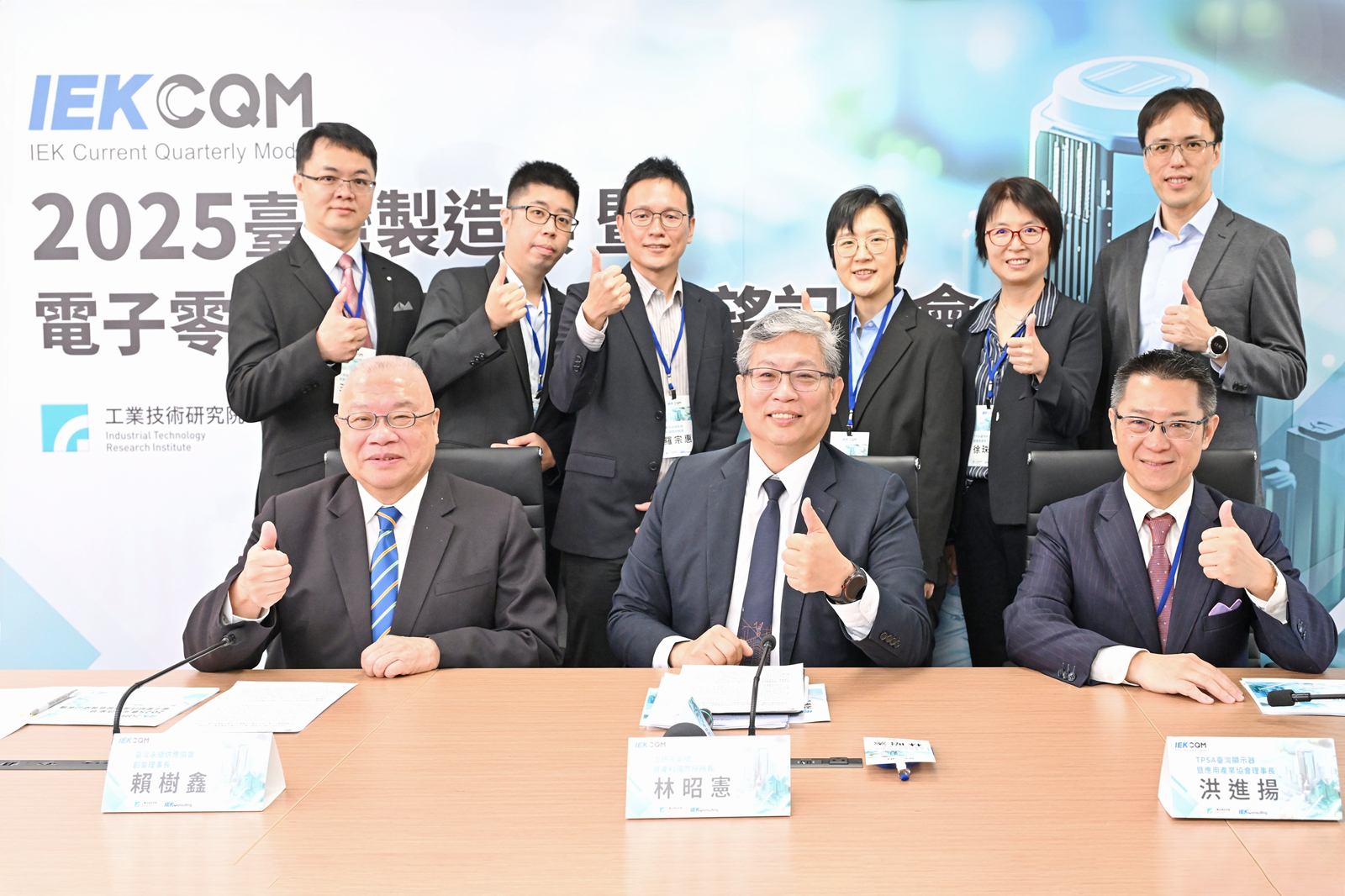 工研院舉辦「2025年臺灣製造業暨電子零組件產業景氣展望記者會」,由工研院產科國際所林昭憲所長(前排中)主持,帶領IEKCQM團隊發布2025年臺灣製造業暨電子零組件3產業景氣展望預測結果,並邀請台灣永續供應協會賴樹鑫創會理事長(前排左)、TPSA台灣顯示器暨應用產業協會洪進揚理事長(前排右)擔任講評人、TPSA台灣顯示器協會徐珠崖秘書長(後排右二)亦一同與會。