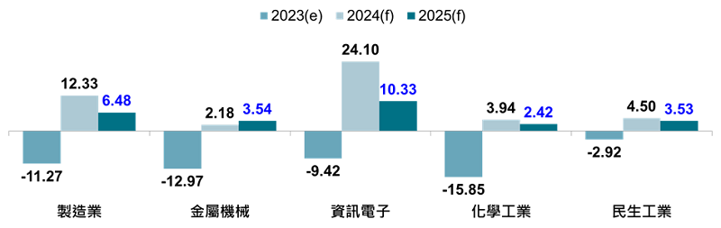 四、民生工業:全球服飾品牌廠庫存進入安全水位、採購活動回歸常軌,在低基期因素下,紡織業動能回升。展望未來,輔以通膨趨緩、央行降息,國際消費回暖,有利紡織業明年營運動能持續。高基期因素下,國內零售及餐飲銷售仍表現穩健,輔以調薪趨勢延續,表演藝術與運動賽事等熱潮不減,民眾消費支出意願仍強,支撐民生工業成長延續。預估2025年民生工業產值將成長3.53%。